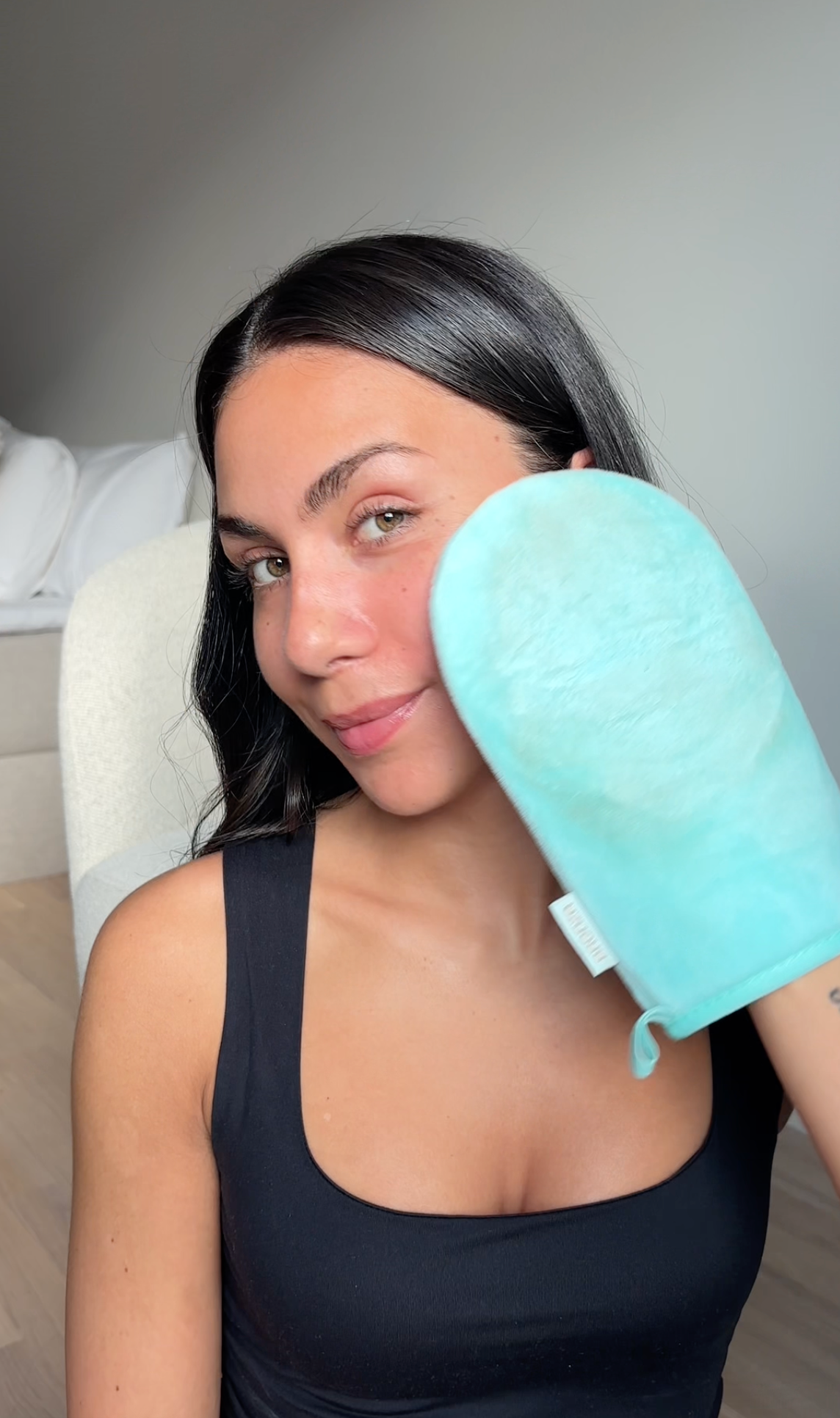Dispense a generous amount of mousse onto a clean Application Mitt. Apply in even, sweeping motions over the skin.